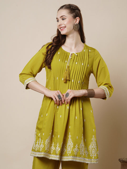 Solid Pin Tucked & Embroidered A-Line Co-ord...