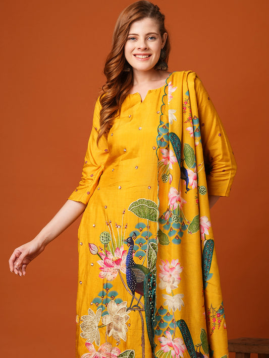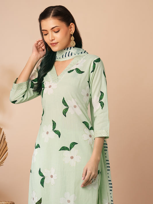 Ethnic Floral Printed & Embroidered Straight Fit...