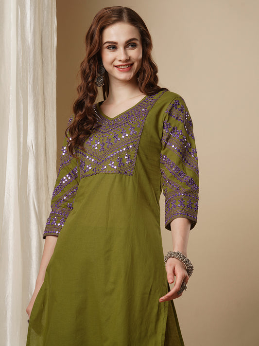 Solid Ethnic Mirror Embroidered Straight Fit Co-ord...