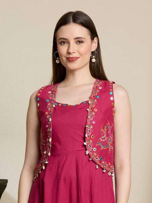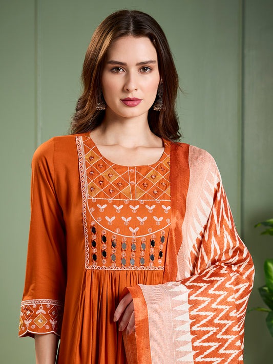 Solid Ethnic Mirror Work A-Line Pleated Kurta...