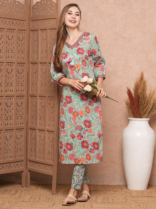 Floral Threadwork Embroidered A-Line Kurta with Pant...