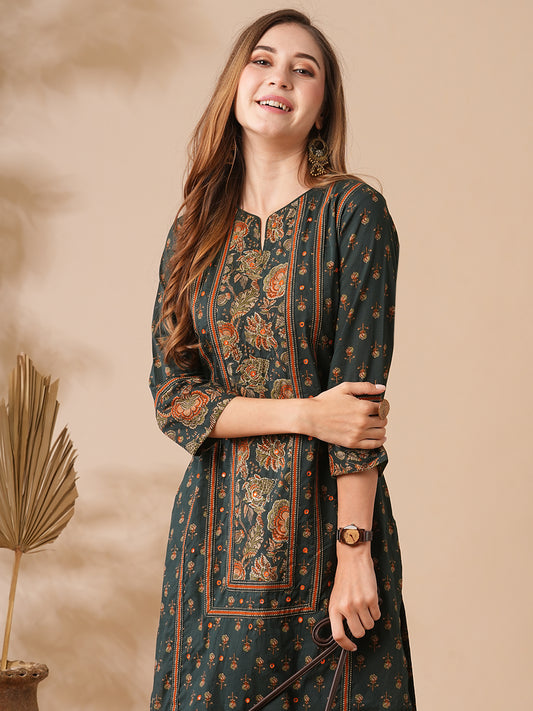 Ethnic Printed Mirror Embroidered Kurta with Flared...