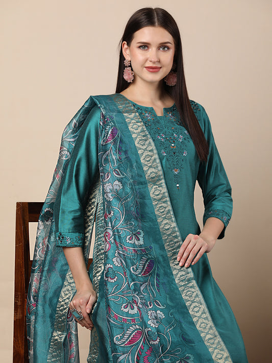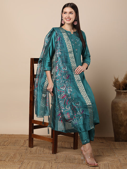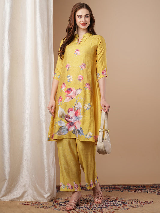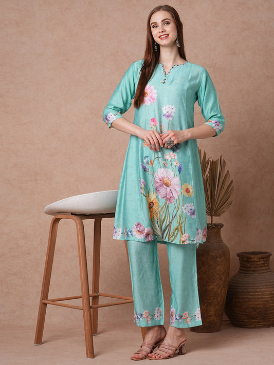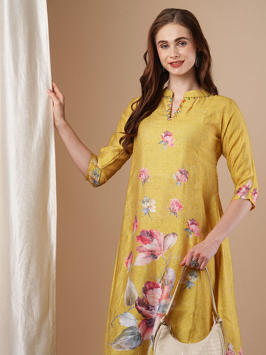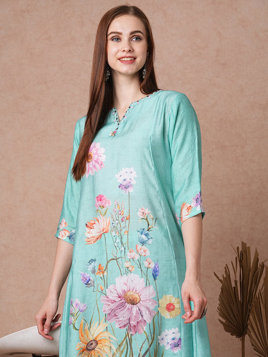 Ethnic Floral Printed & Embroidered Straight Fit...