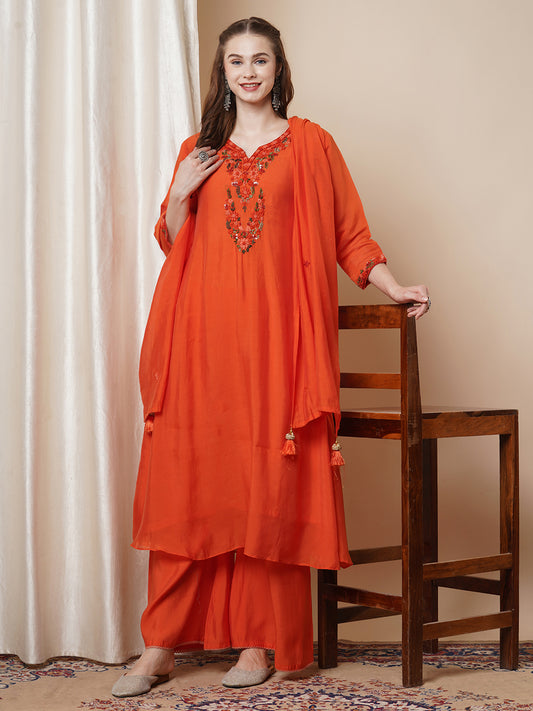 Solid Floral Threadwork A-Line Kurta with Pant...