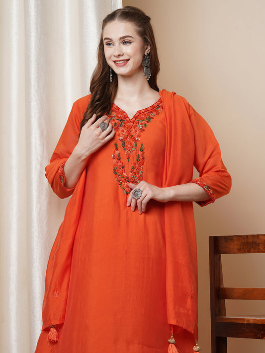 Solid Floral Hand Embroidered Straight Fit Kurta...