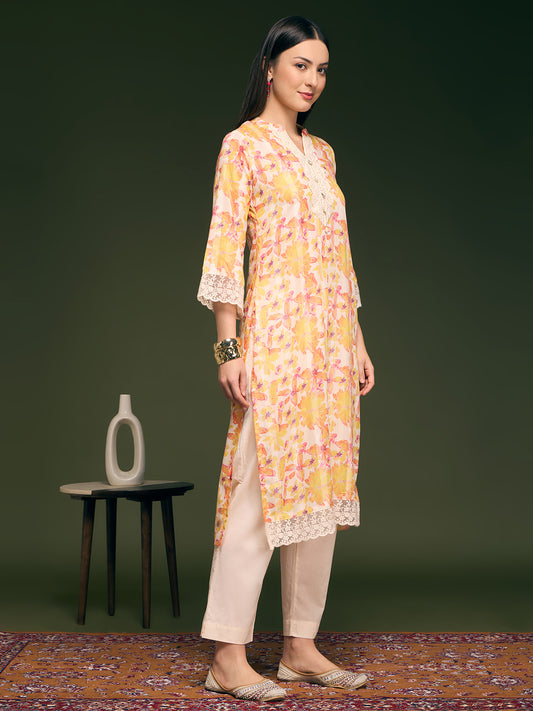 Abstract Floral Printed Embroidered Straight Fit Kurta...