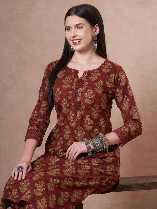 Ethnic Floral Printed Embroidered Straight Fit Kurta...