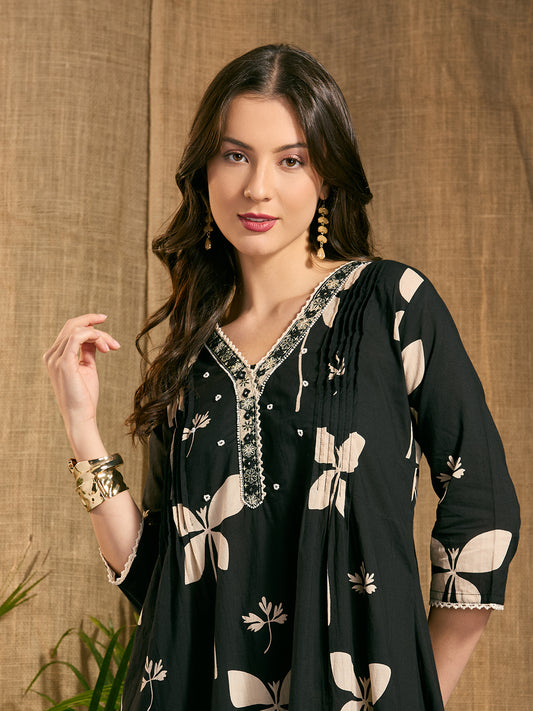 Abstract Floral Printed & Embroidered A-Line Kurta...