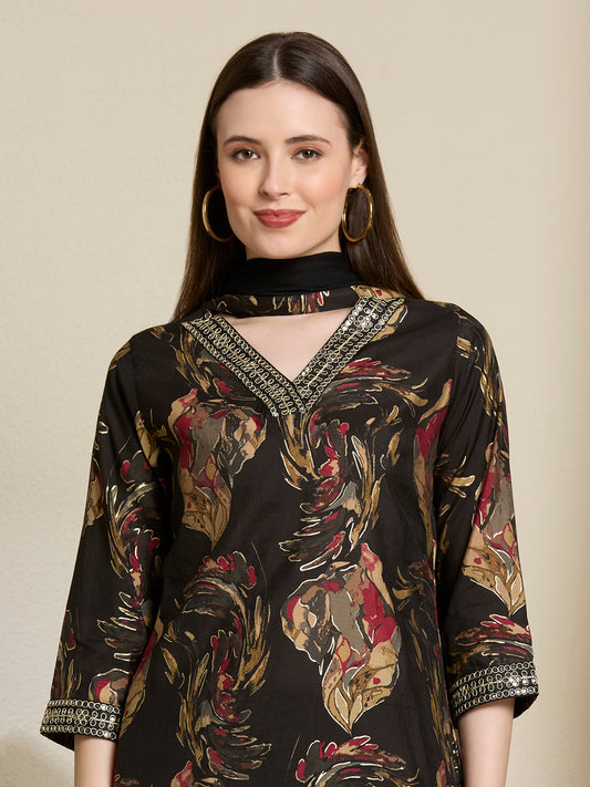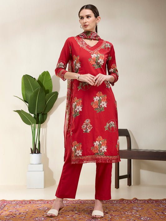 Ethnic Floral Printed Embroidered Straight Kurta with...