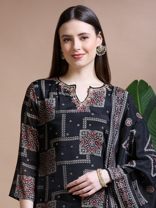 MRP (Inclusive of all taxes)Regular price ₹ 2,449.00₹ 2,449.00 Regular priceUnit price / per₹ 6,199.00Sale priceM L XL 2XL 3XL add to cartSale{"id":7675719581782,"title":"Ethnic Printed \u0026 Embroidered Straight Kurta with Pant \u0026 Duaptta - Black","handle":"ethnic-printed-embroidered-straight-kurta-with-pant-duaptta-black","description":"\u003ch1\u003eHighlights\u003c\/h1\u003e\n\u003cp\u003e\u003cbr\u003e\u003cbr\u003e-Featuring a straight-cut kurta with a classic round neckline adorned with delicate beads and sequin detailing, this set strikes the perfect balance between traditional charm and contemporary finesse. Paired with a solid matching pant for a sleek silhouette and a beautifully printed dupatta to add a splash of flair, it's a timeless choice for festive gatherings or evening soirées.\u003c\/p\u003e\n\u003ch1\u003e\n\u003cbr\u003eFabric \u0026amp; Colour\u003c\/h1\u003e\n\u003cp\u003e\u003cbr\u003eTop Colour: Black\u003cbr\u003eTop Fabric: Muslin Silk\u003cbr\u003eBottom Colour: Black\u003cbr\u003eBottom Fabric: Shantoon\u003cbr\u003eDupatta Colour: Black\u003cbr\u003eDupatta Fabric: Muslin Silk\u003c\/p\u003e\n\u003ch1\u003eSpecifications\u003c\/h1\u003e\n\u003cp\u003e\u003cbr\u003eTop Design: Floral print, Ethnic print\u003cbr\u003eTop Craft: Embroidery, Plain and Prints\u003cbr\u003eTop Shape: Straight\u003cbr\u003eNeck: Round Neck\u003cbr\u003eSleeve Length: Three-Quarter Sleeves\u003cbr\u003eTop Length: Knee Length\u003cbr\u003eHemline: Straight\u003cbr\u003eSlit: Side Slits\u003c\/p\u003e\n\u003cp\u003eBottom Type: Trousers\u003cbr\u003eBottom Closure: Drawstring\u003cbr\u003eWaistband: Partially Elasticated\u003c\/p\u003e\n\u003cp\u003eDupatta Pattern: Printed\u003cbr\u003eDupatta Border: Printed\u003c\/p\u003e\n\u003cp\u003eWash Care: Hand Wash\u003c\/p\u003e\n\u003cp\u003eLength (in inches)\u003cbr\u003eKurta – 45, Sleeves – 17,\u003cbr\u003eBottom – 40\u003c\/p\u003e\n\u003cp\u003eModel’s Height: 5’7”. Wearing Size S.\u003c\/p\u003e\n\u003ch1\u003eProduct Information\u003c\/h1\u003e\n\u003cp\u003e\u003cbr\u003eManufactured\/Packed\/Marketed By:\u003cbr\u003eFashor Lifestyle Pvt. Ltd.\u003cbr\u003e28\/30, Sudarshanpura Industrial Area,\u003cbr\u003eJaipur - 302006.\u003cbr\u003eCountry of Origin: India\u003c\/p\u003e","published_at":"2025-10-16T12:39:38+05:30","created_at":"2025-10-15T16:52:08+05:30","vendor":"FASHOR","type":"3P Kurta Set","tags":["2001-3000","2XL","32912","3XL","All Styles","casualwear","colour_black","craft_embroidery","craft_plain-and-prints","design_ethnic-print","design_floral-print","fabric_muslin-silk","KURTI","kurtis","meta-size-chart-","now-trending","shape_straight"],"price":244900,"price_min":244900,"price_max":244900,"available":true,"price_varies":false,"compare_at_price":619900,"compare_at_price_min":619900,"compare_at_price_max":619900,"compare_at_price_varies":false,"variants":[{"id":43471748399190,"title":"M","option1":"M","option2":null,"option3":null,"sku":"38-ST032912I5FS","requires_shipping":true,"taxable":false,"featured_image":{"id":35410385305686,"product_id":7675719581782,"position":1,"created_at":"2025-10-16T12:37:10+05:30","updated_at":"2025-10-16T12:37:11+05:30","alt":null,"width":1080,"height":1440,"src":"\/\/fashor.com\/cdn\/shop\/files\/32426_1.jpg?v=1760598431","variant_ids":[43471748399190,43471748431958,43471748464726,43471748497494,43471748530262]},"available":false,"name":"Ethnic Printed \u0026 Embroidered Straight Kurta with Pant \u0026 Duaptta - Black - M","public_title":"M","options":["M"],"price":244900,"weight":0,"compare_at_price":619900,"inventory_quantity":0,"inventory_management":"shopify","inventory_policy":"deny","barcode":"","featured_media":{"alt":null,"id":27517639721046,"position":1,"preview_image":{"aspect_ratio":0.75,"height":1440,"width":1080,"src":"\/\/fashor.com\/cdn\/shop\/files\/32426_1.jpg?v=1760598431"}},"requires_selling_plan":false,"selling_plan_allocations":[],"quantity_rule":{"min":1,"max":null,"increment":1}},{"id":43471748431958,"title":"L","option1":"L","option2":null,"option3":null,"sku":"40-ST032912I5FS","requires_shipping":true,"taxable":false,"featured_image":{"id":35410385305686,"product_id":7675719581782,"position":1,"created_at":"2025-10-16T12:37:10+05:30","updated_at":"2025-10-16T12:37:11+05:30","alt":null,"width":1080,"height":1440,"src":"\/\/fashor.com\/cdn\/shop\/files\/32426_1.jpg?v=1760598431","variant_ids":[43471748399190,43471748431958,43471748464726,43471748497494,43471748530262]},"available":false,"name":"Ethnic Printed \u0026 Embroidered Straight Kurta with Pant \u0026 Duaptta - Black - L","public_title":"L","options":["L"],"price":244900,"weight":0,"compare_at_price":619900,"inventory_quantity":0,"inventory_management":"shopify","inventory_policy":"deny","barcode":"","featured_media":{"alt":null,"id":27517639721046,"position":1,"preview_image":{"aspect_ratio":0.75,"height":1440,"width":1080,"src":"\/\/fashor.com\/cdn\/shop\/files\/32426_1.jpg?v=1760598431"}},"requires_selling_plan":false,"selling_plan_allocations":[],"quantity_rule":{"min":1,"max":null,"increment":1}},{"id":43471748464726,"title":"XL","option1":"XL","option2":null,"option3":null,"sku":"42-ST032912I5FS","requires_shipping":true,"taxable":false,"featured_image":{"id":35410385305686,"product_id":7675719581782,"position":1,"created_at":"2025-10-16T12:37:10+05:30","updated_at":"2025-10-16T12:37:11+05:30","alt":null,"width":1080,"height":1440,"src":"\/\/fashor.com\/cdn\/shop\/files\/32426_1.jpg?v=1760598431","variant_ids":[43471748399190,43471748431958,43471748464726,43471748497494,43471748530262]},"available":false,"name":"Ethnic Printed \u0026 Embroidered Straight Kurta with Pant \u0026 Duaptta - Black - XL","public_title":"XL","options":["XL"],"price":244900,"weight":0,"compare_at_price":619900,"inventory_quantity":0,"inventory_management":"shopify","inventory_policy":"deny","barcode":"","featured_media":{"alt":null,"id":27517639721046,"position":1,"preview_image":{"aspect_ratio