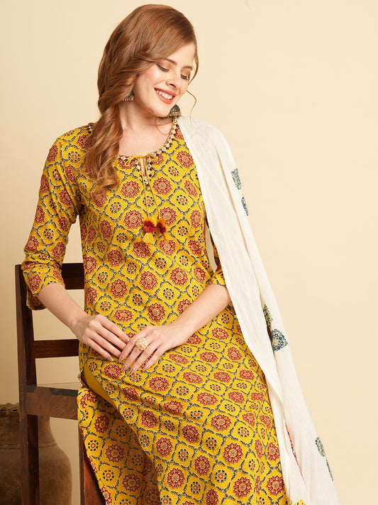 MRP (Inclusive of all taxes)Regular price ₹ 3,299.00₹ 3,299.00 Regular priceUnit price / per₹ 8,299.00Sale priceM L XL 2XL add to cartSale{"id":7712861716566,"title":"Ethnic Printed \u0026 Embroidered Kurta with Pant \u0026 Applique Work Dupatta - Mustard","handle":"ethnic-printed-embroidered-kurta-with-pant-applique-work-dupatta-mustard","description":"\u003ch1\u003eHighlights\u003cbr\u003e\n\u003c\/h1\u003e\n\u003cp\u003e\u003cbr\u003e-Straight Kurta \u003cbr\u003e-Ethnic Prints all over\u003cbr\u003e-Mirror Embroidered neckline\u003cbr\u003e-Comes with Applique Work \u0026amp; Printed Pure Cotton Dupatta\u003c\/p\u003e\n\u003ch1\u003e\n\u003cbr\u003eFabric \u0026amp; Colour\u003c\/h1\u003e\n\u003cp\u003e\u003cbr\u003eTop Colour: Mustard\u003cbr\u003eTop Fabric: Cotton\u003cbr\u003eBottom Colour: Mustard\u003cbr\u003eBottom Fabric: Cotton Blend\u003cbr\u003eDupatta Colour: Multi\u003cbr\u003eDupatta Fabric: Pure Cotton\u003c\/p\u003e\n\u003ch1\u003eSpecifications\u003c\/h1\u003e\n\u003cp\u003e\u003cbr\u003eTop Design: Floral print, Ethnic print\u003cbr\u003eTop Craft: Mirror work, Plain and Prints\u003cbr\u003eTop Shape: Straight\u003cbr\u003eNeck: Round Neck\u003cbr\u003eSleeve Length: Three-Quarter Sleeves\u003cbr\u003eTop Length: Knee Length\u003cbr\u003eHemline: Straight\u003cbr\u003eSlit: Side Slits\u003c\/p\u003e\n\u003cp\u003eBottom Type: Trousers\u003cbr\u003eBottom Closure: Slip-On\u003cbr\u003eWaistband: Partially Elasticated\u003c\/p\u003e\n\u003cp\u003eDupatta Pattern: Embroidered, Printed, Self Design\u003cbr\u003eDupatta Border: Tassels\u003c\/p\u003e\n\u003cp\u003eWash Care: Hand Wash\u003c\/p\u003e\n\u003cp\u003eLength (in inches)\u003cbr\u003eKurta – 44, Sleeves – 16,\u003cbr\u003eBottom – 38\u003c\/p\u003e\n\u003cp\u003eModel’s Height: 5’7”. Wearing Size S.\u003c\/p\u003e\n\u003ch1\u003eProduct Information\u003c\/h1\u003e\n\u003cp\u003e\u003cbr\u003eManufactured\/Packed\/Marketed By:\u003cbr\u003eFashor Lifestyle Pvt. Ltd.\u003cbr\u003e28\/30, Sudarshanpura Industrial Area,\u003cbr\u003eJaipur - 302006.\u003cbr\u003eCountry of Origin: India\u003c\/p\u003e","published_at":"2025-12-02T17:43:19+05:30","created_at":"2025-11-18T14:57:31+05:30","vendor":"FASHOR","type":"3P Kurta Set","tags":["22879","2XL","above-3000","All Styles","casualwear","colour_mustard","craft_mirror-work","craft_plain-and-prints","design_ethnic-print","design_floral-print","fabric_cotton","KURTI","kurtis","M","meta-size-chart-","now-trending","shape-Straight","workwear"],"price":329900,"price_min":329900,"price_max":329900,"available":true,"price_varies":false,"compare_at_price":829900,"compare_at_price_min":829900,"compare_at_price_max":829900,"compare_at_price_varies":false,"variants":[{"id":43654636372054,"title":"M","option1":"M","option2":null,"option3":null,"sku":"38-ST022879D4FS","requires_shipping":true,"taxable":true,"featured_image":{"id":35672714575958,"product_id":7712861716566,"position":4,"created_at":"2025-11-18T14:57:55+05:30","updated_at":"2025-11-18T14:58:33+05:30","alt":null,"width":1080,"height":1440,"src":"\/\/fashor.com\/cdn\/shop\/files\/26443_15.jpg?v=1763458113","variant_ids":[43654636372054,43654636404822,43654636437590,43654636470358]},"available":true,"name":"Ethnic Printed \u0026 Embroidered Kurta with Pant \u0026 Applique Work Dupatta - Mustard - M","public_title":"M","options":["M"],"price":329900,"weight":0,"compare_at_price":829900,"inventory_quantity":4,"inventory_management":"shopify","inventory_policy":"deny","barcode":"","featured_media":{"alt":null,"id":27756365316182,"position":4,"preview_image":{"aspect_ratio":0.75,"height":1440,"width":1080,"src":"\/\/fashor.com\/cdn\/shop\/files\/26443_15.jpg?v=1763458113"}},"requires_selling_plan":false,"selling_plan_allocations":[],"quantity_rule":{"min":1,"max":null,"increment":1}},{"id":43654636404822,"title":"L","option1":"L","option2":null,"option3":null,"sku":"40-ST022879D4FS","requires_shipping":true,"taxable":true,"featured_image":{"id":35672714575958,"product_id":7712861716566,"position":4,"created_at":"2025-11-18T14:57:55+05:30","updated_at":"2025-11-18T14:58:33+05:30","alt":null,"width":1080,"height":1440,"src":"\/\/fashor.com\/cdn\/shop\/files\/26443_15.jpg?v=1763458113","variant_ids":[43654636372054,43654636404822,43654636437590,43654636470358]},"available":false,"name":"Ethnic Printed \u0026 Embroidered Kurta with Pant \u0026 Applique Work Dupatta - Mustard - L","public_title":"L","options":["L"],"price":329900,"weight":0,"compare_at_price":829900,"inventory_quantity":0,"inventory_management":"shopify","inventory_policy":"deny","barcode":"","featured_media":{"alt":null,"id":27756365316182,"position":4,"preview_image":{"aspect_ratio":0.75,"height":1440,"width":1080,"src":"\/\/fashor.com\/cdn\/shop\/files\/26443_15.jpg?v=1763458113"}},"requires_selling_plan":false,"selling_plan_allocations":[],"quantity_rule":{"min":1,"max":null,"increment":1}},{"id":43654636437590,"title":"XL","option1":"XL","option2":null,"option3":null,"sku":"42-ST022879D4FS","requires_shipping":true,"taxable":true,"featured_image":{"id":35672714575958,"product_id":7712861716566,"position":4,"created_at":"2025-11-18T14:57:55+05:30","updated_at":"2025-11-18T14:58:33+05:30","alt":null,"width":1080,"height":1440,"src":"\/\/fashor.com\/cdn\/shop\/files\/26443_15.jpg?v=1763458113","variant_ids":[43654636372054,43654636404822,43654636437590,43654636470358]},"available":false,"name":"Ethnic Printed \u0026 Embroidered Kurta with Pant \u0026 Applique Work Dupatta - Mustard - XL","public_title":"XL","options":["XL"],"price":329900,"weight":0,"compare_at_price":829900,"inventory_quantity":0,"inventory_management":"shopify","inventory_policy":"deny","barcode":"","featured_media":{"alt":null,"id":27756365316182,"position":4,"preview_image":{"aspect_ratio":0.75,"height":1440,"width":1080,"src":"\/\/fashor.com\/cdn\/shop\/files\/26443_15.jpg?v=1763458113"}},"requires_selling_plan":false,"selling_plan_allocations":[],"quantity_rule":{"min":
