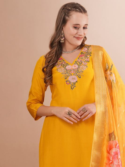 MRP (Inclusive of all taxes)Regular price ₹ 3,049.00₹ 3,049.00 Regular priceUnit price / per₹ 7,699.00Sale priceS M L XL 2XL add to cartSale{"id":7712860471382,"title":"Solid Floral Hand Embroidered Straight Kurta with Pant \u0026 Printed Dupatta - Yellow","handle":"solid-floral-hand-embroidered-straight-kurta-with-pant-printed-dupatta-yellow","description":"\u003ch1\u003eHighlights\u003c\/h1\u003e\n\u003cp\u003e\u003cbr\u003e\u003cbr\u003e-Straight Fit Kurta\u003cbr\u003e-Floral Hand Embroidered Neckline\u003cbr\u003e-Comes with Floral Printed Dupatta\u003c\/p\u003e\n\u003ch1\u003e\n\u003cbr\u003eFabric \u0026amp; Colour\u003c\/h1\u003e\n\u003cp\u003e\u003cbr\u003eTop Colour: Yellow\u003cbr\u003eTop Fabric: Muslin Silk\u003cbr\u003eBottom Colour: Yellow\u003cbr\u003eBottom Fabric: Muslin Silk\u003cbr\u003eDupatta Colour: Yellow\u003cbr\u003eDupatta Fabric: Poly Chanderi\u003c\/p\u003e\n\u003ch1\u003eSpecifications\u003c\/h1\u003e\n\u003cp\u003e\u003cbr\u003eTop Design: Solid\u003cbr\u003eTop Craft: Embroidery, Plain and Prints\u003cbr\u003eTop Shape: Straight\u003cbr\u003eNeck: V-Neck\u003cbr\u003eSleeve Length: Three-Quarter Sleeves\u003cbr\u003eTop Length: Knee Length\u003cbr\u003eHemline: Straight\u003cbr\u003eSlit: Side Slits\u003c\/p\u003e\n\u003cp\u003eBottom Type: Trousers\u003cbr\u003eBottom Closure: Slip-On\u003cbr\u003eWaistband: Elasticated\u003c\/p\u003e\n\u003cp\u003eDupatta Pattern: Printed, Self Design\u003cbr\u003eDupatta Border: Solid\u003c\/p\u003e\n\u003cp\u003eWash Care: Hand Wash\u003c\/p\u003e\n\u003cp\u003eLength (in inches)\u003cbr\u003eKurta – 46, Sleeves – 17\u003cbr\u003eBottom – 38\u003c\/p\u003e\n\u003cp\u003eModel’s Height: 5’7”. Wearing Size S.\u003c\/p\u003e\n\u003ch1\u003eProduct Information\u003c\/h1\u003e\n\u003cp\u003e\u003cbr\u003eManufactured\/Packed\/Marketed By:\u003cbr\u003eFashor Lifestyle Pvt. Ltd.\u003cbr\u003e28\/30, Sudarshanpura Industrial Area,\u003cbr\u003eJaipur - 302006.\u003cbr\u003eCountry of Origin: India\u003c\/p\u003e","published_at":"2025-11-27T13:34:56+05:30","created_at":"2025-11-18T14:54:30+05:30","vendor":"FASHOR","type":"3P Kurta Set","tags":["23718","2XL","above-3000","All Styles","casualwear","colour_yellow","craft_embroidery","craft_plain-and-prints","design_solid","fabric_muslin-silk","KURTI","kurtis","meta-size-chart-","now-trending","S","shape_straight"],"price":304900,"price_min":304900,"price_max":304900,"available":true,"price_varies":false,"compare_at_price":769900,"compare_at_price_min":769900,"compare_at_price_max":769900,"compare_at_price_varies":false,"variants":[{"id":43654629949526,"title":"S","option1":"S","option2":null,"option3":null,"sku":"36-STA23718E4FS","requires_shipping":true,"taxable":true,"featured_image":{"id":35672708284502,"product_id":7712860471382,"position":1,"created_at":"2025-11-18T14:54:50+05:30","updated_at":"2025-11-18T14:54:52+05:30","alt":null,"width":1080,"height":1440,"src":"\/\/fashor.com\/cdn\/shop\/files\/27585_1.jpg?v=1763457892","variant_ids":[43654629949526,43685122637910,43685122670678,43685122703446,43685122736214]},"available":true,"name":"Solid Floral Hand Embroidered Straight Kurta with Pant \u0026 Printed Dupatta - Yellow - S","public_title":"S","options":["S"],"price":304900,"weight":0,"compare_at_price":769900,"inventory_quantity":5,"inventory_management":"shopify","inventory_policy":"deny","barcode":"","featured_media":{"alt":null,"id":27756359024726,"position":1,"preview_image":{"aspect_ratio":0.75,"height":1440,"width":1080,"src":"\/\/fashor.com\/cdn\/shop\/files\/27585_1.jpg?v=1763457892"}},"requires_selling_plan":false,"selling_plan_allocations":[],"quantity_rule":{"min":1,"max":null,"increment":1}},{"id":43685122637910,"title":"M","option1":"M","option2":null,"option3":null,"sku":"38-STA23718E4FS","requires_shipping":true,"taxable":true,"featured_image":{"id":35672708284502,"product_id":7712860471382,"position":1,"created_at":"2025-11-18T14:54:50+05:30","updated_at":"2025-11-18T14:54:52+05:30","alt":null,"width":1080,"height":1440,"src":"\/\/fashor.com\/cdn\/shop\/files\/27585_1.jpg?v=1763457892","variant_ids":[43654629949526,43685122637910,43685122670678,43685122703446,43685122736214]},"available":false,"name":"Solid Floral Hand Embroidered Straight Kurta with Pant \u0026 Printed Dupatta - Yellow - M","public_title":"M","options":["M"],"price":304900,"weight":0,"compare_at_price":769900,"inventory_quantity":0,"inventory_management":"shopify","inventory_policy":"deny","barcode":"","featured_media":{"alt":null,"id":27756359024726,"position":1,"preview_image":{"aspect_ratio":0.75,"height":1440,"width":1080,"src":"\/\/fashor.com\/cdn\/shop\/files\/27585_1.jpg?v=1763457892"}},"requires_selling_plan":false,"selling_plan_allocations":[],"quantity_rule":{"min":1,"max":null,"increment":1}},{"id":43685122670678,"title":"L","option1":"L","option2":null,"option3":null,"sku":"40-STA23718E4FS","requires_shipping":true,"taxable":true,"featured_image":{"id":35672708284502,"product_id":7712860471382,"position":1,"created_at":"2025-11-18T14:54:50+05:30","updated_at":"2025-11-18T14:54:52+05:30","alt":null,"width":1080,"height":1440,"src":"\/\/fashor.com\/cdn\/shop\/files\/27585_1.jpg?v=1763457892","variant_ids":[43654629949526,43685122637910,43685122670678,43685122703446,43685122736214]},"available":false,"name":"Solid Floral Hand Embroidered Straight Kurta with Pant \u0026 Printed Dupatta - Yellow - L","public_title":"L","options":["L"],"price":304900,"weight":0,"compare_at_price":769900,"inventory_quantity":0,"inventory_management":"shopify","inventory_policy":"deny","barcode":"","featured_media":{"alt":null,"id":27756359024726,"position":1,"preview_image":{"aspect_ratio":0.75,"height":1440,"width":1080,"src":"\/\/fashor.com\/cdn\/shop\/files\/27585_1.jpg?v=1763457892"}},"requires_selling_plan":false,"selling_plan_allocations":[],"quantity_rule":{"min":1,"max":null,"increment":1}},{"id":43685122703446,"title":"XL","option1":"XL","option2":null,"option3":null,"sku