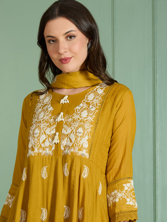 Solid Threadwork Embroidered A-Line Kurta with Pant...