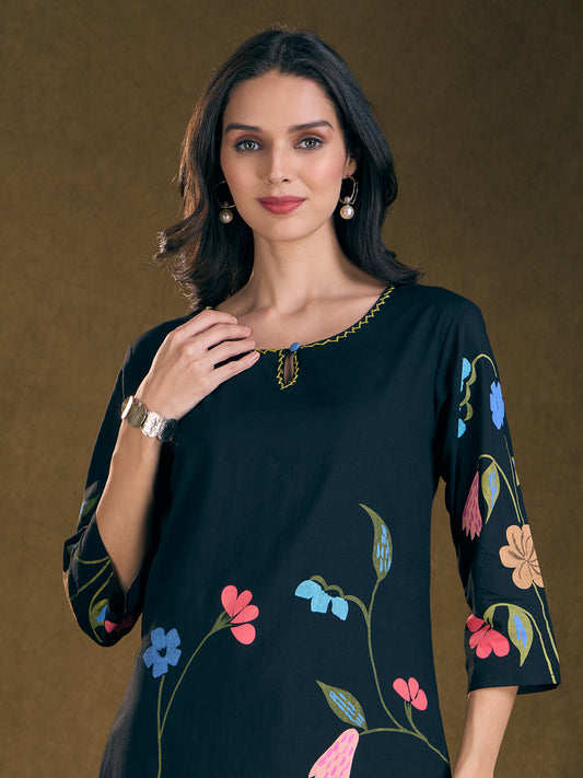 Ethnic Floral Printed & Embroidered A-Line Kurta...