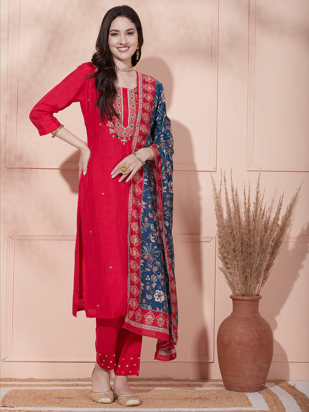 Ethnic Floral Printed & Embroidered Straight Fit...