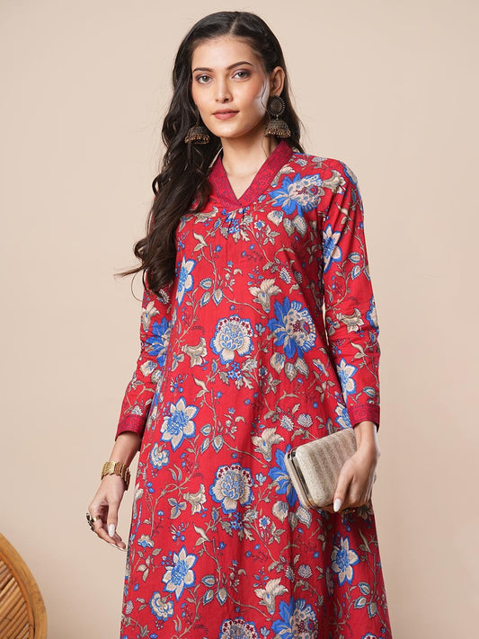 Ethnic Floral Printed A-Line Paneled Kurta with...