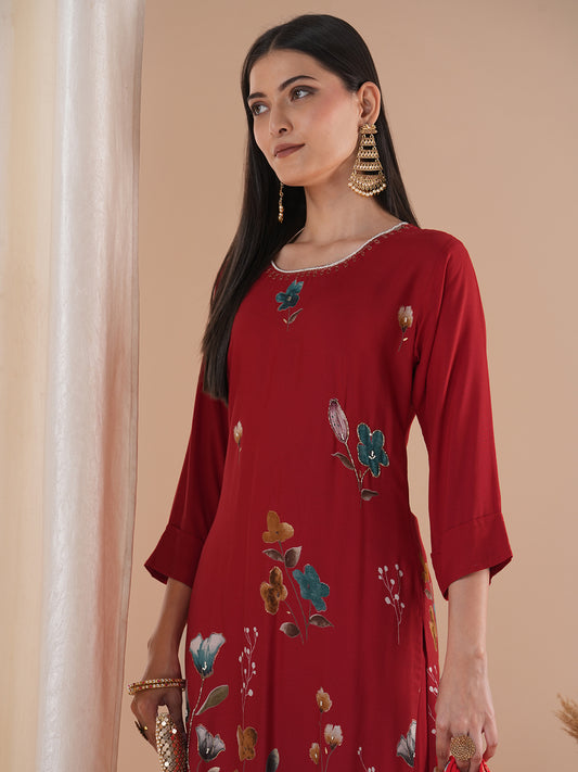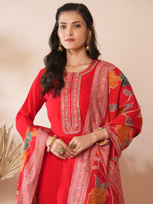 Solid Ethnic Floral Embroidered Kurta with Pant...