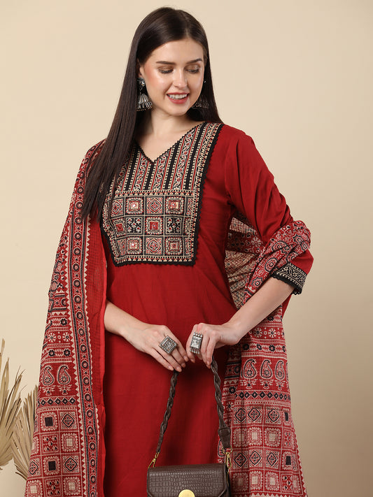 MRP (Inclusive of all taxes)Regular price ₹ 1,899.00₹ 1,899.00 Regular priceUnit price / per₹ 4,799.00Sale priceM L XL 2XL 3XL add to cartSale{"id":7661142442070,"title":"Solid Threadwork Embroidered Straight Fit Kurta with Palazzo and Dupatta - Red","handle":"solid-threadwork-embroidered-straight-fit-kurta-with-palazzo-and-dupatta-red","description":"\u003ch1\u003eHighlights\u003cbr\u003e\n\u003c\/h1\u003e\n\u003cp\u003e\u003cbr\u003e-Elevate your ethnic charm with this Solid Threadwork Embroidered Straight Fit Kurta set in a rich red hue. Crafted from breathable cotton, it features a smart mandarin collar and delicate threadwork embroidery at the front. Paired with a matching solid palazzo and a pure cotton dupatta, this ensemble blends elegance with effortless comfort—perfect for festive and casual occasions alike.\u003c\/p\u003e\n\u003ch1\u003e\n\u003cbr\u003eFabric \u0026amp; Colour\u003c\/h1\u003e\n\u003cp\u003e\u003cbr\u003eTop Colour: Red\u003cbr\u003eTop Fabric: Cotton\u003cbr\u003eBottom Colour: Red\u003cbr\u003eBottom Fabric: Cotton Blend\u003cbr\u003eDupatta Colour: Red\u003cbr\u003eDupatta Fabric: Pure Cotton\u003c\/p\u003e\n\u003ch1\u003eSpecifications\u003c\/h1\u003e\n\u003cp\u003e\u003cbr\u003eTop Design: Solid\u003cbr\u003eTop Craft: Embroidery, Plain and Prints\u003cbr\u003eTop Shape: Straight\u003cbr\u003eNeck: Mandarin Collar\u003cbr\u003eSleeve Length: Three-Quarter Sleeves\u003cbr\u003eTop Length: Knee Length\u003cbr\u003eHemline: Straight\u003cbr\u003eSlit: Side Slits\u003c\/p\u003e\n\u003cp\u003eBottom Type: Palazzos\u003cbr\u003eBottom Closure: Slip-On\u003cbr\u003eWaistband: Elasticated\u003c\/p\u003e\n\u003cp\u003eDupatta Pattern: Solid\u003cbr\u003eDupatta Border: Taping\u003c\/p\u003e\n\u003cp\u003eWash Care: Hand Wash\u003c\/p\u003e\n\u003cp\u003eLength (in inches)\u003cbr\u003eKurta – 45, Sleeves – 17,\u003cbr\u003eBottom – 38\u003c\/p\u003e\n\u003cp\u003eModel’s Height: 5’7”. Wearing Size S.\u003c\/p\u003e\n\u003ch1\u003eProduct Information\u003c\/h1\u003e\n\u003cp\u003e\u003cbr\u003eManufactured\/Packed\/Marketed By:\u003cbr\u003eFashor Lifestyle Pvt. Ltd.\u003cbr\u003e28\/30, Sudarshanpura Industrial Area,\u003cbr\u003eJaipur - 302006.\u003cbr\u003eCountry of Origin: India\u003c\/p\u003e","published_at":"2025-11-25T10:21:26+05:30","created_at":"2025-09-26T14:31:27+05:30","vendor":"FASHOR","type":"3P Kurta Set","tags":["1001-2000","2XL","32156","3XL","All Styles","casualwear","colour_red","craft_embroidery","craft_plain-and-prints","design_solid","fabric_cotton","KURTI","kurtis","L","M","meta-size-chart-","now-trending","shape_straight","XL"],"price":189900,"price_min":189900,"price_max":189900,"available":true,"price_varies":false,"compare_at_price":479900,"compare_at_price_min":479900,"compare_at_price_max":479900,"compare_at_price_varies":false,"variants":[{"id":43402031759446,"title":"M","option1":"M","option2":null,"option3":null,"sku":"38-STA32156G5FS","requires_shipping":true,"taxable":false,"featured_image":{"id":35254366994518,"product_id":7661142442070,"position":3,"created_at":"2025-09-26T14:31:57+05:30","updated_at":"2025-09-26T14:33:13+05:30","alt":null,"width":1080,"height":1440,"src":"\/\/fashor.com\/cdn\/shop\/files\/32201_1.jpg?v=1758877393","variant_ids":[43402031759446,43402031792214,43402031824982,43402031857750,43402031890518]},"available":true,"name":"Solid Threadwork Embroidered Straight Fit Kurta with Palazzo and Dupatta - Red - M","public_title":"M","options":["M"],"price":189900,"weight":0,"compare_at_price":479900,"inventory_quantity":20,"inventory_management":"shopify","inventory_policy":"deny","barcode":"","featured_media":{"alt":null,"id":27367787987030,"position":3,"preview_image":{"aspect_ratio":0.75,"height":1440,"width":1080,"src":"\/\/fashor.com\/cdn\/shop\/files\/32201_1.jpg?v=1758877393"}},"requires_selling_plan":false,"selling_plan_allocations":[],"quantity_rule":{"min":1,"max":null,"increment":1}},{"id":43402031792214,"title":"L","option1":"L","option2":null,"option3":null,"sku":"40-STA32156G5FS","requires_shipping":true,"taxable":false,"featured_image":{"id":35254366994518,"product_id":7661142442070,"position":3,"created_at":"2025-09-26T14:31:57+05:30","updated_at":"2025-09-26T14:33:13+05:30","alt":null,"width":1080,"height":1440,"src":"\/\/fashor.com\/cdn\/shop\/files\/32201_1.jpg?v=1758877393","variant_ids":[43402031759446,43402031792214,43402031824982,43402031857750,43402031890518]},"available":true,"name":"Solid Threadwork Embroidered Straight Fit Kurta with Palazzo and Dupatta - Red - L","public_title":"L","options":["L"],"price":189900,"weight":0,"compare_at_price":479900,"inventory_quantity":17,"inventory_management":"shopify","inventory_policy":"deny","barcode":"","featured_media":{"alt":null,"id":27367787987030,"position":3,"preview_image":{"aspect_ratio":0.75,"height":1440,"width":1080,"src":"\/\/fashor.com\/cdn\/shop\/files\/32201_1.jpg?v=1758877393"}},"requires_selling_plan":false,"selling_plan_allocations":[],"quantity_rule":{"min":1,"max":null,"increment":1}},{"id":43402031824982,"title":"XL","option1":"XL","option2":null,"option3":null,"sku":"42-STA32156G5FS","requires_shipping":true,"taxable":false,"featured_image":{"id":35254366994518,"product_id":7661142442070,"position":3,"created_at":"2025-09-26T14:31:57+05:30","updated_at":"2025-09-26T14:33:13+05:30","alt":null,"width":1080,"height":1440,"src":"\/\/fashor.com\/cdn\/shop\/files\/32201_1.jpg?v=1758877393","variant_ids":[43402031759446,43402031792214,43402031824982,43402031857750,43402031890518]},"available":true,"name":"Solid Threadwork Embroidered Straight Fit Kurta with Palazzo and Dupatta - Red - XL","public_title":"XL","options":["XL"],"price":189900,"weight":0,"compare_at_price":479900,"inventory_quantity":7,"inventory_management":"shopify","inventory_policy":"deny","barcode":"","featured_media":{"alt":null,"id":27367787987030,"position":3,"preview_image":{"aspect_ratio":0.75,"height":1440,"width":1080,"src":"\/\/fashor.co