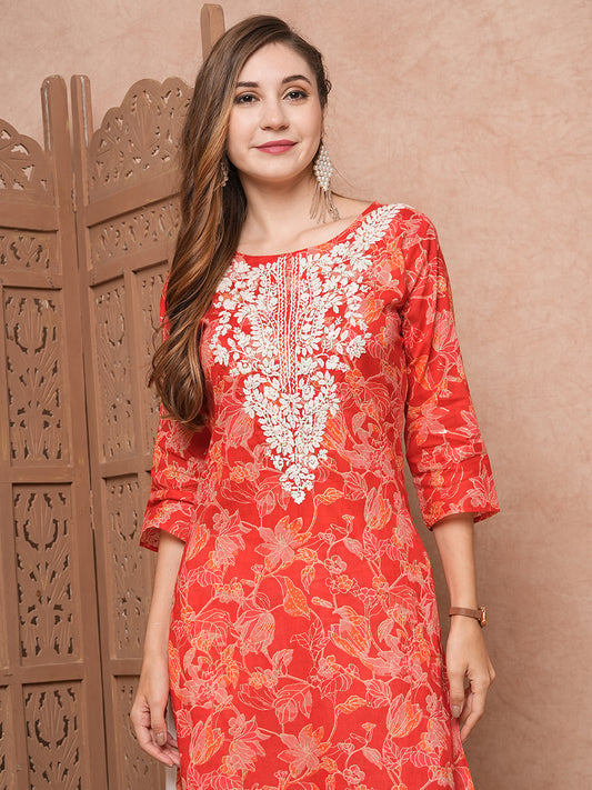 Floral Printed Resham & Sequins Embroidered Kurta...