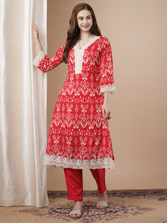 Ethnic Ikat Printed A-Line Flared Kurta with...