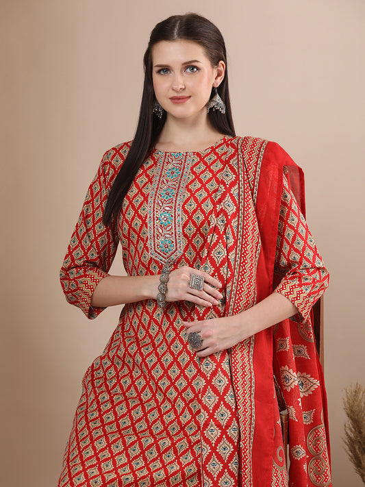 Leheriya Printed Embroidered Straight Fit Kurta with...