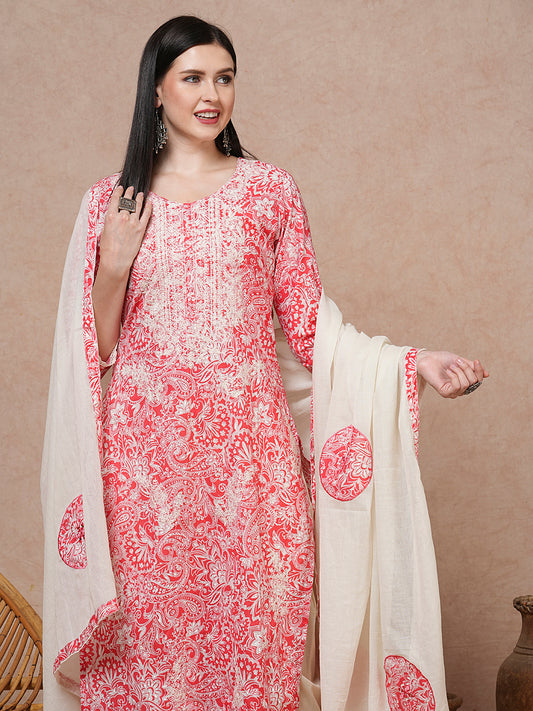Ethnic Floral Printed & Embroidered Straight Fit...