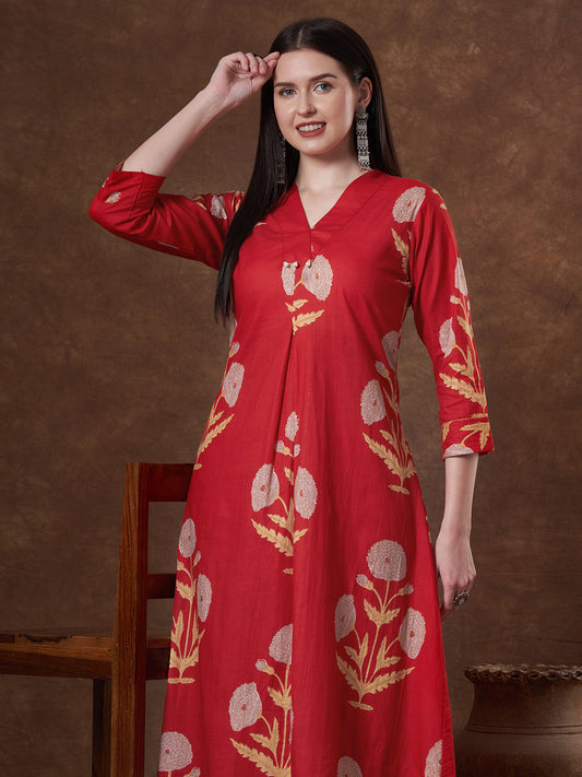 Ethnic Floral Printed Embroidered Straight Fit Kurta...