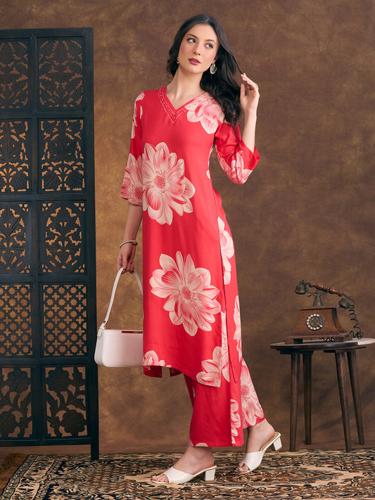 Floral Printed Embellished Straight Cut Kurta with...