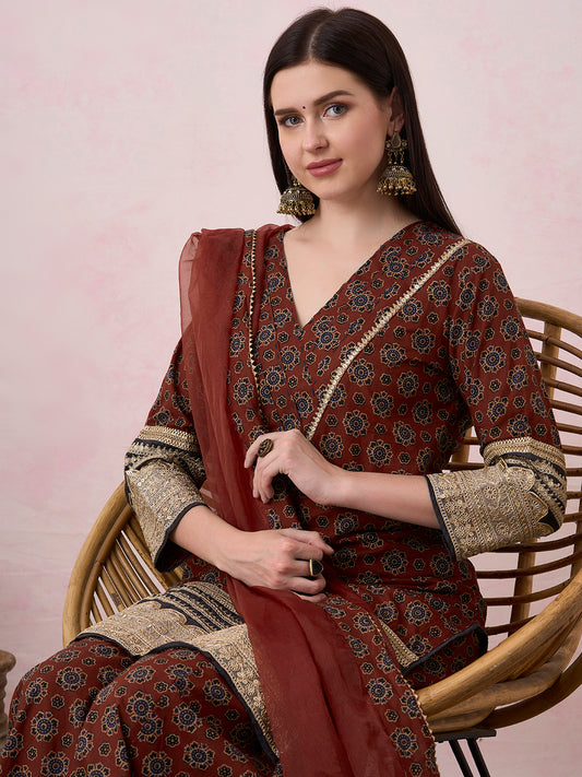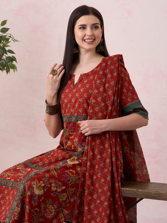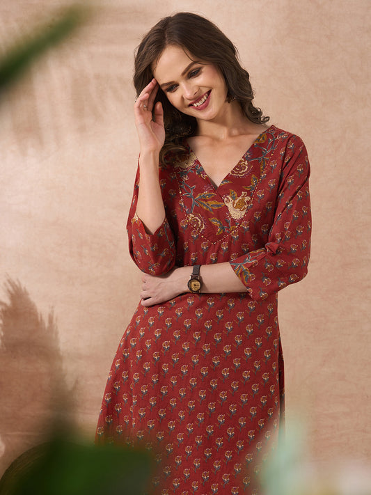 Ethnic Floral Printed Embroidered A-Line Kurta with...
