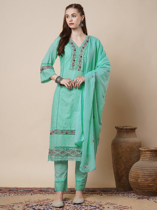 Solid Embossed Floral & Schiffli Embroidered Straight...