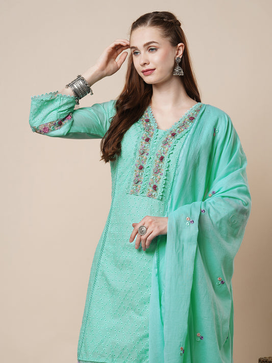 Solid Schiffli Floral Embroidered Straight Kurta with...