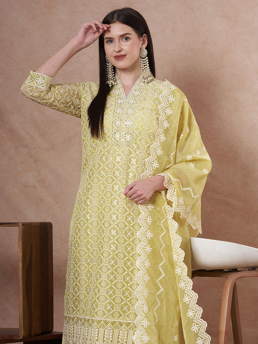 Solid Schiffli Floral Embroidered Straight Kurta with...