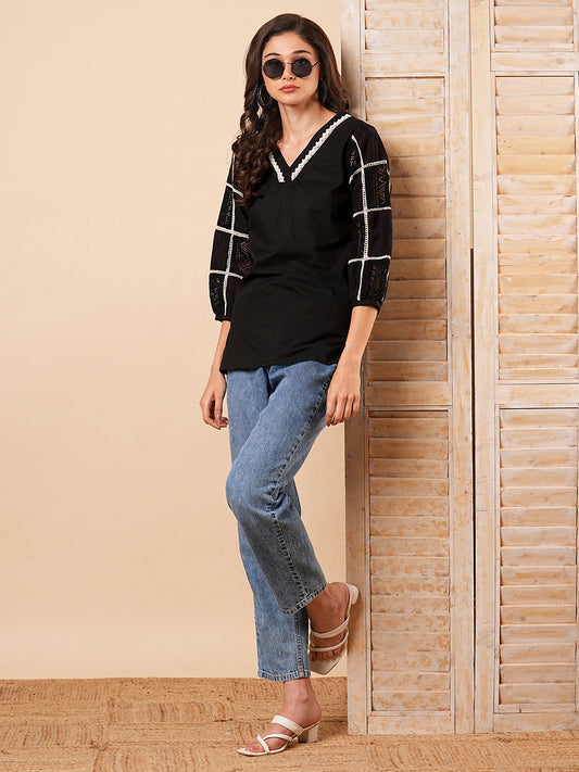 Solid Schiffli Embroidered A-Line Short Kurti -...