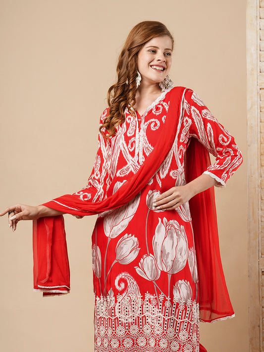 Ethnic Ikat Printed & Schiffli Embroidered Straight...