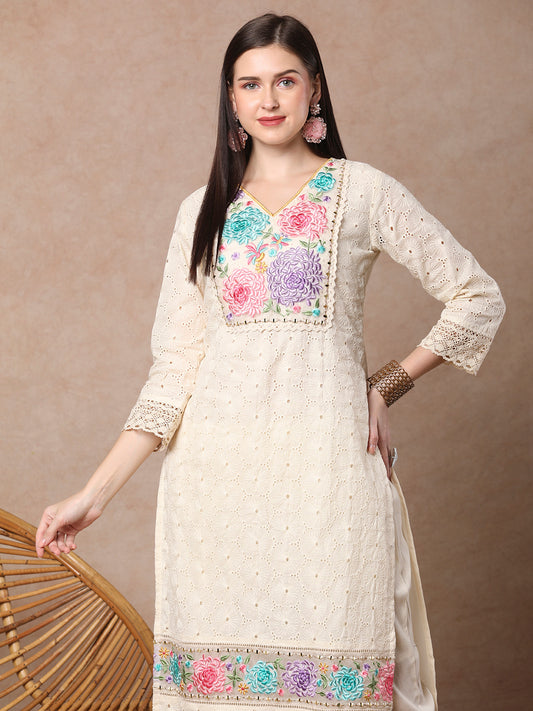 Solid Schiffli Floral Embroidered Straight Kurta with...