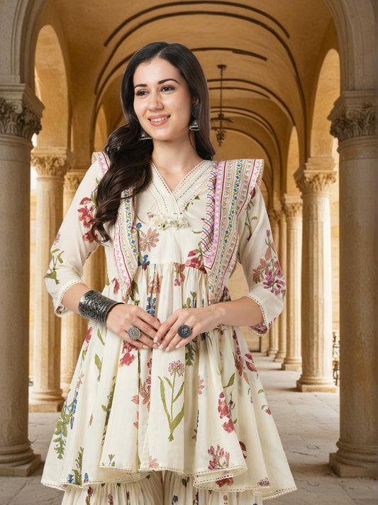 Quirky Floral Printed Cotton Anarkali Sharara Set...