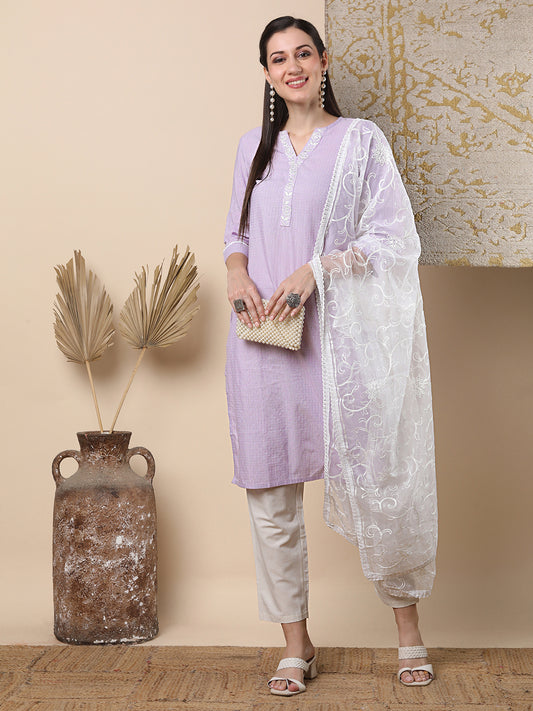 MRP (Inclusive of all taxes)Regular price ₹ 1,499.00₹ 1,499.00 Regular priceUnit price / per₹ 4,199.00Sale priceM L XL 2XL add to cartSale{"id":7533287604310,"title":"Solid Stripes Woven Straight Fit Kurta with Pant \u0026 Dupatta - Lavender","handle":"solid-stripes-woven-straight-fit-kurta-with-pant-dupatta-lavender","description":"\u003ch1\u003eHighlights\u003c\/h1\u003e\n\u003cp\u003e\u003cbr\u003e-This straight fit kurta with stripes woven all over and floral embroidery on neckline, paired with solid pant and comes with floral embroidered organza dupatta is perfectly suited for everyday wear, offering both comfort and style.\u003c\/p\u003e\n\u003ch1\u003eFabric \u0026amp; Colour\u003c\/h1\u003e\n\u003cp\u003e\u003cbr\u003eTop Colour: Lavender\u003cbr\u003eTop Fabric: Cotton\u003cbr\u003eBottom Colour: Off White\u003cbr\u003eBottom Fabric: Cotton Blend\u003cbr\u003eDupatta Colour: White\u003cbr\u003eDupatta Fabric: Organza\u003c\/p\u003e\n\u003ch1\u003eSpecifications\u003c\/h1\u003e\n\u003cp\u003e\u003cbr\u003eTop Design: Solid\u003cbr\u003eTop Craft: Embroidery, Plain and Prints\u003cbr\u003eTop Shape: Straight\u003cbr\u003eNeck: Round Neck\u003cbr\u003eSleeve Length: Three-Quarter Sleeves\u003cbr\u003eTop Length: Knee Length\u003cbr\u003eHemline: Straight\u003cbr\u003eSlit: Side Slits\u003c\/p\u003e\n\u003cp\u003eBottom Type: Trousers\u003cbr\u003eBottom Closure: Slip-On\u003cbr\u003eWaistband: Partially Elasticated\u003c\/p\u003e\n\u003cp\u003eDupatta Pattern: Embroidered, Solid\u003cbr\u003eDupatta Border: Taping\u003c\/p\u003e\n\u003cp\u003eWash Care: Hand Wash\u003c\/p\u003e\n\u003cp\u003eLength (in inches)\u003cbr\u003eKurta – 41, Sleeves – 17,\u003cbr\u003eBottom – 40\u003c\/p\u003e\n\u003cp\u003eModel’s Height: 5’7”. Wearing Size S.\u003c\/p\u003e\n\u003ch1\u003eProduct Information\u003c\/h1\u003e\n\u003cp\u003e\u003cbr\u003eManufactured\/Packed\/Marketed By:\u003cbr\u003eFashor Lifestyle Pvt. Ltd.\u003cbr\u003e28\/30, Sudarshanpura Industrial Area,\u003cbr\u003eJaipur - 302006.\u003cbr\u003eCountry of Origin: India\u003c\/p\u003e","published_at":"2025-04-04T14:18:19+05:30","created_at":"2025-04-03T14:55:53+05:30","vendor":"FASHOR","type":"3P Kurta Set","tags":["1001-2000","2XL","30364","All Styles","casualwear","colour_lavender","craft_embroidery","craft_plain-and-prints","design_solid","fabric_cotton","KURTI","kurtis","L","M","meta-size-chart-","monsoo","now-trending","offer-zone","shape_straight","workwear","XL"],"price":149900,"price_min":149900,"price_max":149900,"available":true,"price_varies":false,"compare_at_price":419900,"compare_at_price_min":419900,"compare_at_price_max":419900,"compare_at_price_varies":false,"variants":[{"id":42224732700758,"title":"M","option1":"M","option2":null,"option3":null,"sku":"38-STA30364B5FS","requires_shipping":true,"taxable":false,"featured_image":{"id":34229826420822,"product_id":7533287604310,"position":1,"created_at":"2025-04-03T14:56:30+05:30","updated_at":"2025-04-07T11:54:47+05:30","alt":null,"width":1080,"height":1440,"src":"\/\/fashor.com\/cdn\/shop\/files\/30368_8.jpg?v=1744007087","variant_ids":[42224732700758,42224732733526,42224732766294,42224732799062]},"available":true,"name":"Solid Stripes Woven Straight Fit Kurta with Pant \u0026 Dupatta - Lavender - M","public_title":"M","options":["M"],"price":149900,"weight":0,"compare_at_price":419900,"inventory_quantity":4,"inventory_management":"shopify","inventory_policy":"deny","barcode":"","featured_media":{"alt":null,"id":26624414777430,"position":1,"preview_image":{"aspect_ratio":0.75,"height":1440,"width":1080,"src":"\/\/fashor.com\/cdn\/shop\/files\/30368_8.jpg?v=1744007087"}},"requires_selling_plan":false,"selling_plan_allocations":[],"quantity_rule":{"min":1,"max":null,"increment":1}},{"id":42224732733526,"title":"L","option1":"L","option2":null,"option3":null,"sku":"40-STA30364B5FS","requires_shipping":true,"taxable":false,"featured_image":{"id":34229826420822,"product_id":7533287604310,"position":1,"created_at":"2025-04-03T14:56:30+05:30","updated_at":"2025-04-07T11:54:47+05:30","alt":null,"width":1080,"height":1440,"src":"\/\/fashor.com\/cdn\/shop\/files\/30368_8.jpg?v=1744007087","variant_ids":[42224732700758,42224732733526,42224732766294,42224732799062]},"available":true,"name":"Solid Stripes Woven Straight Fit Kurta with Pant \u0026 Dupatta - Lavender - L","public_title":"L","options":["L"],"price":149900,"weight":0,"compare_at_price":419900,"inventory_quantity":6,"inventory_management":"shopify","inventory_policy":"deny","barcode":"","featured_media":{"alt":null,"id":26624414777430,"position":1,"preview_image":{"aspect_ratio":0.75,"height":1440,"width":1080,"src":"\/\/fashor.com\/cdn\/shop\/files\/30368_8.jpg?v=1744007087"}},"requires_selling_plan":false,"selling_plan_allocations":[],"quantity_rule":{"min":1,"max":null,"increment":1}},{"id":42224732766294,"title":"XL","option1":"XL","option2":null,"option3":null,"sku":"42-STA30364B5FS","requires_shipping":true,"taxable":false,"featured_image":{"id":34229826420822,"product_id":7533287604310,"position":1,"created_at":"2025-04-03T14:56:30+05:30","updated_at":"2025-04-07T11:54:47+05:30","alt":null,"width":1080,"height":1440,"src":"\/\/fashor.com\/cdn\/shop\/files\/30368_8.jpg?v=1744007087","variant_ids":[42224732700758,42224732733526,42224732766294,42224732799062]},"available":true,"name":"Solid Stripes Woven Straight Fit Kurta with Pant \u0026 Dupatta - Lavender - XL","public_title":"XL","options":["XL"],"price":149900,"weight":0,"compare_at_price":419900,"inventory_quantity":1,"inventory_management":"shopify","inventory_policy":"deny","barcode":"","featured_media":{"alt":null,"id":26624414777430,"position":1,"preview_image":{"aspect_ratio":0.75,"height":1440,"width":1080,"src":"\/\/fashor.com\/cdn\/shop\/files\/30368_8.jpg?v=1744007087"}},"requires_selling_plan":false,"selling_plan_allocations":[],"quantity_rule":{"min":1,"max":null,"increment":1}},{"id":42224732799062,"title":"2XL","option1":"2XL"