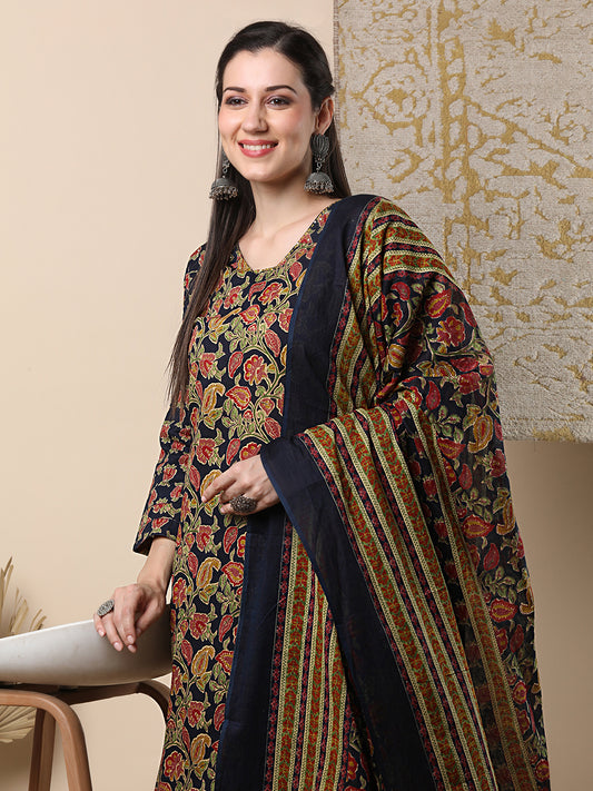 Ethnic Floral Printed & Embroidered Straight Fit...