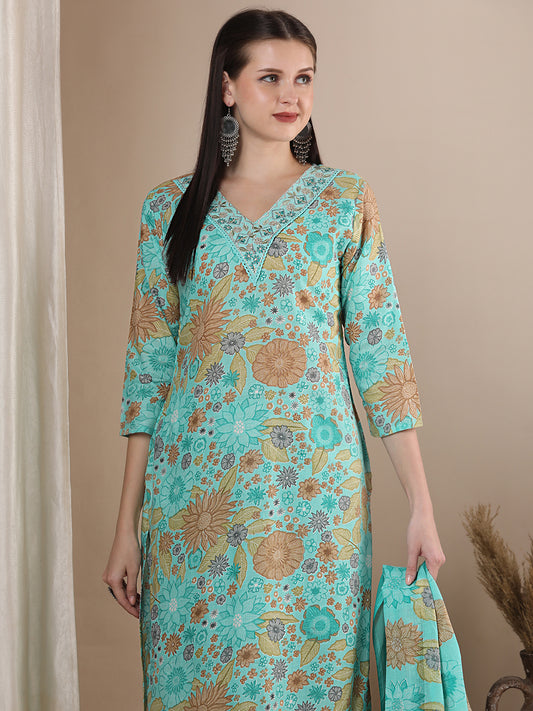 Abstract Floral Printed Embroidered Straight Fit Tissue...
