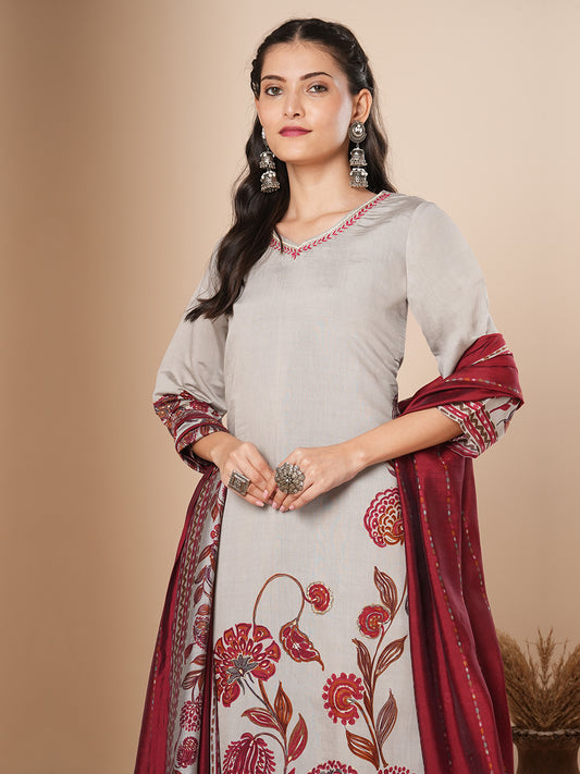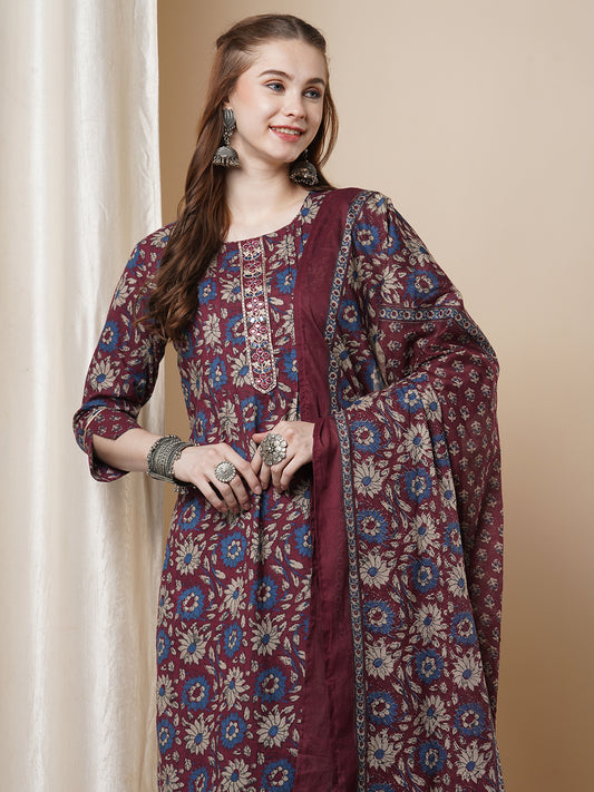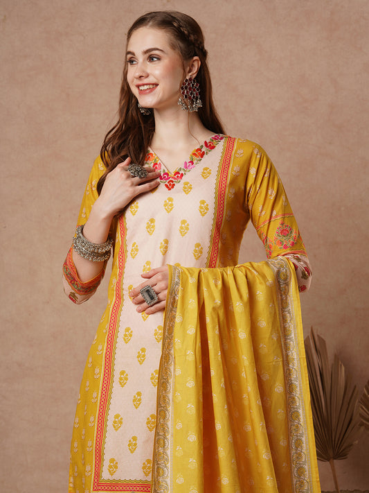 Ethnic Floral Printed & Embroidered Straight Fit...
