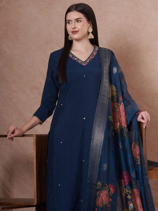 Solid Peacock Printed & Hand Embroidered Straight...