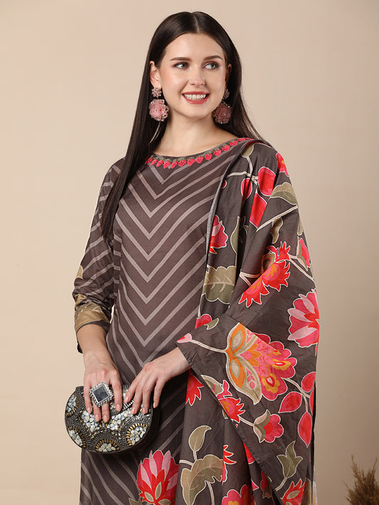 Ethnic Floral Printed & Hand Embroidered Straight...
