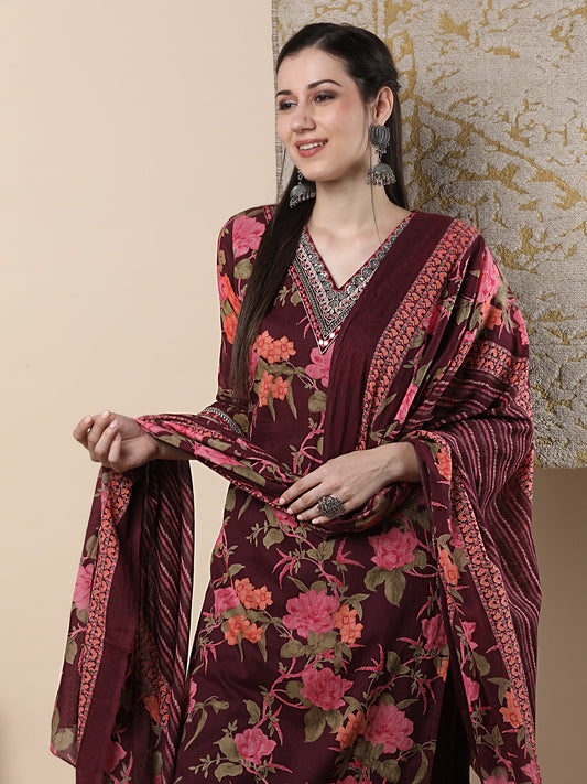 Floral Printed & Embroidered Straight Kurta with...