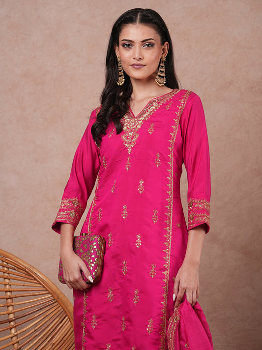 Solid Ethnic Zari Embroidered Straight Kurta with...