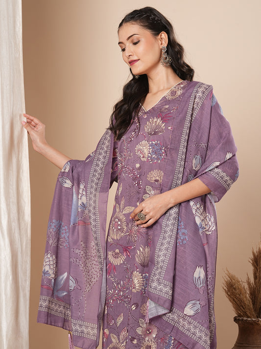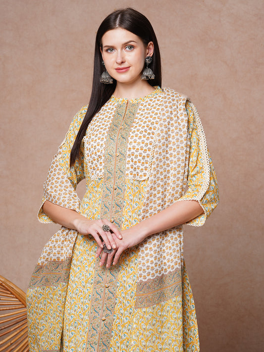 Ethnic Floral Printed & Embroidered Straight Fit...