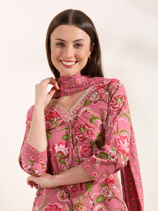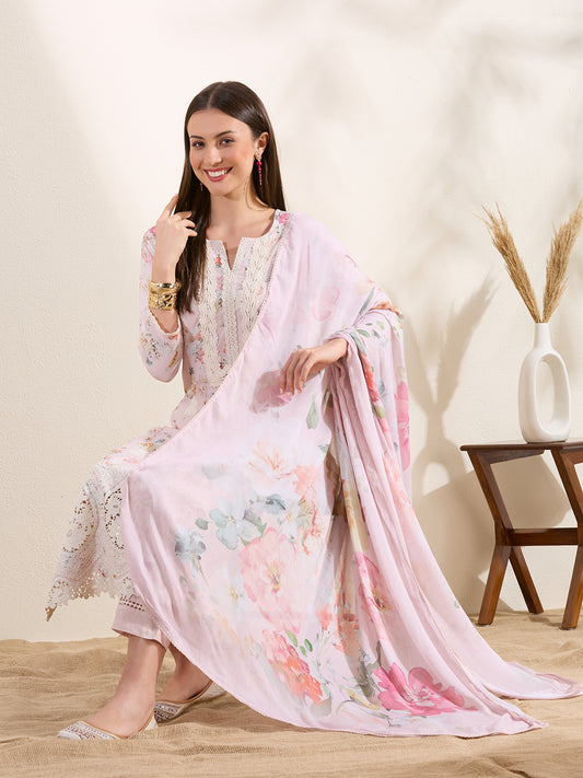 Ethnic Floral Printed & Hand Embroidered Straight...
