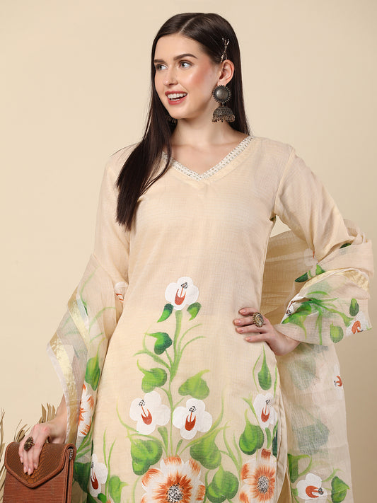 Floral Printed Hand Embroidered Straight Fit Tissue...