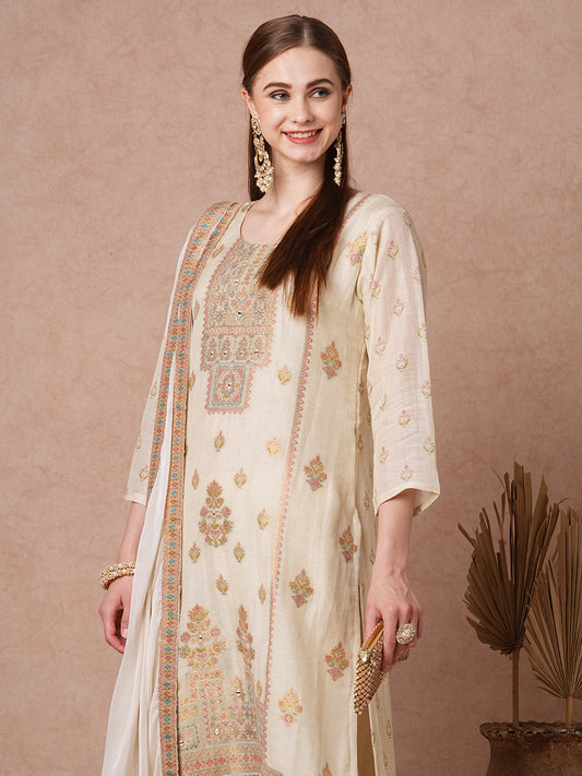 Ethnic Floral Printed & Embroidered Straight Fit...