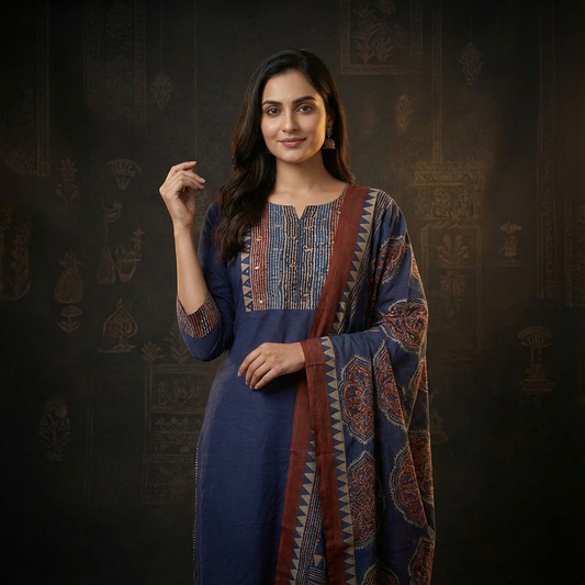 MRP (Inclusive of all taxes)Regular price ₹ 1,699.00₹ 1,699.00 Regular priceUnit price / per₹ 4,299.00Sale priceM L XL 2XL 3XL add to cartSale{"id":7741777772630,"title":"Solid Ethnic Straight Fit Kurta with Printed Pant \u0026 Cotton Dupatta - Navy Blue","handle":"solid-ethnic-straight-fit-kurta-with-printed-pant-cotton-dupatta-navy-blue","description":"\u003ch1\u003eHighlights\u003c\/h1\u003e\n\u003cp\u003e\u003cbr\u003e\u003cbr\u003e-Elevate your everyday ethnic style with this Solid Straight-Fit Kurta Set in Navy Blue. Crafted from soft, breathable cotton, the kurta features a classic round neckline adorned with subtle cutdana detailing for a hint of shimmer. Paired with a complementing printed pant and a lightweight cotton dupatta, this ensemble blends timeless elegance with effortless comfort—perfect for refined daywear and graceful evenings alike.\u003c\/p\u003e\n\u003ch1\u003e\n\u003cbr\u003eFabric \u0026amp; Colour\u003c\/h1\u003e\n\u003cp\u003e\u003cbr\u003eTop Colour: Navy Blue\u003cbr\u003eTop Fabric: Cotton\u003cbr\u003eBottom Colour: Multi\u003cbr\u003eBottom Fabric: Cotton Blend\u003cbr\u003eDupatta Colour: Navy Blue\u003cbr\u003eDupatta Fabric: Pure Cotton\u003c\/p\u003e\n\u003ch1\u003eSpecifications\u003c\/h1\u003e\n\u003cp\u003e\u003cbr\u003eTop Design: Ethnic print\u003cbr\u003eTop Craft: Embroidery, Plain and Prints\u003cbr\u003eTop Shape: Straight\u003cbr\u003eNeck: Round Neck\u003cbr\u003eSleeve Length: Three-Quarter Sleeves\u003cbr\u003eTop Length: Calf Length\u003cbr\u003eHemline: Straight\u003cbr\u003eSlit: Side Slits\u003c\/p\u003e\n\u003cp\u003eBottom Type: Trousers\u003cbr\u003eBottom Closure: Slip-On\u003cbr\u003eWaistband: Partially Elasticated\u003c\/p\u003e\n\u003cp\u003eDupatta Pattern: Printed\u003cbr\u003eDupatta Border: Printed\u003c\/p\u003e\n\u003cp\u003eWash Care: Hand Wash\u003c\/p\u003e\n\u003cp\u003eLength (in inches)\u003cbr\u003eKurta – 44, Sleeves – 17,\u003cbr\u003eBottom – 42\u003c\/p\u003e\n\u003cp\u003eModel’s Height: 5’7”. Wearing Size S.\u003c\/p\u003e\n\u003ch1\u003eProduct Information\u003c\/h1\u003e\n\u003cp\u003e\u003cbr\u003eManufactured\/Packed\/Marketed By:\u003cbr\u003eFashor Lifestyle Pvt. Ltd.\u003cbr\u003e28\/30, Sudarshanpura Industrial Area,\u003cbr\u003eJaipur - 302006.\u003cbr\u003eCountry of Origin: India\u003c\/p\u003e","published_at":"2025-12-26T08:15:03+05:30","created_at":"2025-12-24T09:58:11+05:30","vendor":"FASHOR","type":"3P Kurta Set","tags":["1001-2000","2XL","33364","3XL","All Styles","casualwear","colour_blue","craft_embroidery","craft_plain-and-prints","design_ethnic-print","fabric_cotton","KURTI","kurtis","L","M","meta-size-chart-","now-trending","shape_straight","XL"],"price":169900,"price_min":169900,"price_max":169900,"available":true,"price_varies":false,"compare_at_price":429900,"compare_at_price_min":429900,"compare_at_price_max":429900,"compare_at_price_varies":false,"variants":[{"id":43763946127446,"title":"M","option1":"M","option2":null,"option3":null,"sku":"38-STC33364J5FS","requires_shipping":true,"taxable":true,"featured_image":{"id":35927009984598,"product_id":7741777772630,"position":1,"created_at":"2025-12-26T08:13:29+05:30","updated_at":"2025-12-26T08:13:30+05:30","alt":null,"width":1024,"height":1024,"src":"\/\/fashor.com\/cdn\/shop\/files\/32957_1.png?v=1766717010","variant_ids":[43763946127446,43763946160214,43763946192982,43763946225750,43763946258518]},"available":true,"name":"Solid Ethnic Straight Fit Kurta with Printed Pant \u0026 Cotton Dupatta - Navy Blue - M","public_title":"M","options":["M"],"price":169900,"weight":0,"compare_at_price":429900,"inventory_quantity":4,"inventory_management":"shopify","inventory_policy":"deny","barcode":"","featured_media":{"alt":null,"id":28001089519702,"position":1,"preview_image":{"aspect_ratio":1.0,"height":1024,"width":1024,"src":"\/\/fashor.com\/cdn\/shop\/files\/32957_1.png?v=1766717010"}},"requires_selling_plan":false,"selling_plan_allocations":[],"quantity_rule":{"min":1,"max":null,"increment":1}},{"id":43763946160214,"title":"L","option1":"L","option2":null,"option3":null,"sku":"40-STC33364J5FS","requires_shipping":true,"taxable":true,"featured_image":{"id":35927009984598,"product_id":7741777772630,"position":1,"created_at":"2025-12-26T08:13:29+05:30","updated_at":"2025-12-26T08:13:30+05:30","alt":null,"width":1024,"height":1024,"src":"\/\/fashor.com\/cdn\/shop\/files\/32957_1.png?v=1766717010","variant_ids":[43763946127446,43763946160214,43763946192982,43763946225750,43763946258518]},"available":true,"name":"Solid Ethnic Straight Fit Kurta with Printed Pant \u0026 Cotton Dupatta - Navy Blue - L","public_title":"L","options":["L"],"price":169900,"weight":0,"compare_at_price":429900,"inventory_quantity":6,"inventory_management":"shopify","inventory_policy":"deny","barcode":"","featured_media":{"alt":null,"id":28001089519702,"position":1,"preview_image":{"aspect_ratio":1.0,"height":1024,"width":1024,"src":"\/\/fashor.com\/cdn\/shop\/files\/32957_1.png?v=1766717010"}},"requires_selling_plan":false,"selling_plan_allocations":[],"quantity_rule":{"min":1,"max":null,"increment":1}},{"id":43763946192982,"title":"XL","option1":"XL","option2":null,"option3":null,"sku":"42-STC33364J5FS","requires_shipping":true,"taxable":true,"featured_image":{"id":35927009984598,"product_id":7741777772630,"position":1,"created_at":"2025-12-26T08:13:29+05:30","updated_at":"2025-12-26T08:13:30+05:30","alt":null,"width":1024,"height":1024,"src":"\/\/fashor.com\/cdn\/shop\/files\/32957_1.png?v=1766717010","variant_ids":[43763946127446,43763946160214,43763946192982,43763946225750,43763946258518]},"available":true,"name":"Solid Ethnic Straight Fit Kurta with Printed Pant \u0026 Cotton Dupatta - Navy Blue - XL","public_title":"XL","options":["XL"],"price":169900,"weight":0,"compare_at_price":429900,"inventory_quantity":6,"inventory_management":"shopify","inventory_policy":"deny","barcode":"","featured_media":{"alt":null,"id":28001089519702,"position":1,"p