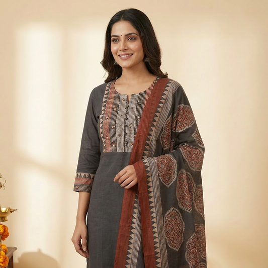 MRP (Inclusive of all taxes)Regular price ₹ 1,699.00₹ 1,699.00 Regular priceUnit price / per₹ 4,299.00Sale priceM L XL 2XL 3XL add to cartSale{"id":7741777444950,"title":"Solid Ethnic Straight Fit Kurta with Printed Pant \u0026 Cotton Dupatta - Rust","handle":"solid-ethnic-straight-fit-kurta-with-printed-pant-cotton-dupatta-rust","description":"\u003ch1\u003eHighlights\u003cbr\u003e\n\u003c\/h1\u003e\n\u003cp\u003e\u003cbr\u003e-Elevate your everyday ethnic style with this Solid Straight-Fit Kurta Set in Rust. Crafted from soft, breathable cotton, the kurta features a classic round neckline adorned with subtle cutdana detailing for a hint of shimmer. Paired with a complementing printed pant and a lightweight cotton dupatta, this ensemble blends timeless elegance with effortless comfort—perfect for refined daywear and graceful evenings alike.\u003c\/p\u003e\n\u003ch1\u003e\n\u003cbr\u003eFabric \u0026amp; Colour\u003c\/h1\u003e\n\u003cp\u003e\u003cbr\u003eTop Colour: Rust\u003cbr\u003eTop Fabric: Cotton\u003cbr\u003eBottom Colour: Multi\u003cbr\u003eBottom Fabric: Cotton Blend\u003cbr\u003eDupatta Colour: Navy Blue\u003cbr\u003eDupatta Fabric: Pure Cotton\u003c\/p\u003e\n\u003ch1\u003eSpecifications\u003c\/h1\u003e\n\u003cp\u003e\u003cbr\u003eTop Design: Ethnic print\u003cbr\u003eTop Craft: Embroidery, Plain and Prints\u003cbr\u003eTop Shape: Straight\u003cbr\u003eNeck: Round Neck\u003cbr\u003eSleeve Length: Three-Quarter Sleeves\u003cbr\u003eTop Length: Calf Length\u003cbr\u003eHemline: Straight\u003cbr\u003eSlit: Side Slits\u003c\/p\u003e\n\u003cp\u003eBottom Type: Trousers\u003cbr\u003eBottom Closure: Slip-On\u003cbr\u003eWaistband: Partially Elasticated\u003c\/p\u003e\n\u003cp\u003eDupatta Pattern: Printed\u003cbr\u003eDupatta Border: Printed\u003c\/p\u003e\n\u003cp\u003eWash Care: Hand Wash\u003c\/p\u003e\n\u003cp\u003eLength (in inches)\u003cbr\u003eKurta – 44, Sleeves – 17,\u003cbr\u003eBottom – 42\u003c\/p\u003e\n\u003cp\u003eModel’s Height: 5’7”. Wearing Size S.\u003c\/p\u003e\n\u003ch1\u003eProduct Information\u003c\/h1\u003e\n\u003cp\u003e\u003cbr\u003eManufactured\/Packed\/Marketed By:\u003cbr\u003eFashor Lifestyle Pvt. Ltd.\u003cbr\u003e28\/30, Sudarshanpura Industrial Area,\u003cbr\u003eJaipur - 302006.\u003cbr\u003eCountry of Origin: India\u003c\/p\u003e","published_at":"2025-12-26T08:16:31+05:30","created_at":"2025-12-24T09:53:35+05:30","vendor":"FASHOR","type":"3P Kurta Set","tags":["1001-2000","2XL","33362","3XL","All Styles","casualwear","colour_rust","craft_embroidery","craft_plain-and-prints","design_ethnic-print","fabric_cotton","KURTI","kurtis","L","M","meta-size-chart-","now-trending","shape_straight","XL"],"price":169900,"price_min":169900,"price_max":169900,"available":true,"price_varies":false,"compare_at_price":429900,"compare_at_price_min":429900,"compare_at_price_max":429900,"compare_at_price_varies":false,"variants":[{"id":43763936362582,"title":"M","option1":"M","option2":null,"option3":null,"sku":"38-STA33362J5FS","requires_shipping":true,"taxable":true,"featured_image":{"id":35926992027734,"product_id":7741777444950,"position":1,"created_at":"2025-12-26T08:07:17+05:30","updated_at":"2025-12-26T08:07:20+05:30","alt":null,"width":1536,"height":2752,"src":"\/\/fashor.com\/cdn\/shop\/files\/32952_1.png?v=1766716640","variant_ids":[43763936362582,43763936395350,43763936428118,43763936460886,43763936493654]},"available":true,"name":"Solid Ethnic Straight Fit Kurta with Printed Pant \u0026 Cotton Dupatta - Rust - M","public_title":"M","options":["M"],"price":169900,"weight":0,"compare_at_price":429900,"inventory_quantity":4,"inventory_management":"shopify","inventory_policy":"deny","barcode":"","featured_media":{"alt":null,"id":28001071562838,"position":1,"preview_image":{"aspect_ratio":0.558,"height":2752,"width":1536,"src":"\/\/fashor.com\/cdn\/shop\/files\/32952_1.png?v=1766716640"}},"requires_selling_plan":false,"selling_plan_allocations":[],"quantity_rule":{"min":1,"max":null,"increment":1}},{"id":43763936395350,"title":"L","option1":"L","option2":null,"option3":null,"sku":"40-STA33362J5FS","requires_shipping":true,"taxable":true,"featured_image":{"id":35926992027734,"product_id":7741777444950,"position":1,"created_at":"2025-12-26T08:07:17+05:30","updated_at":"2025-12-26T08:07:20+05:30","alt":null,"width":1536,"height":2752,"src":"\/\/fashor.com\/cdn\/shop\/files\/32952_1.png?v=1766716640","variant_ids":[43763936362582,43763936395350,43763936428118,43763936460886,43763936493654]},"available":true,"name":"Solid Ethnic Straight Fit Kurta with Printed Pant \u0026 Cotton Dupatta - Rust - L","public_title":"L","options":["L"],"price":169900,"weight":0,"compare_at_price":429900,"inventory_quantity":6,"inventory_management":"shopify","inventory_policy":"deny","barcode":"","featured_media":{"alt":null,"id":28001071562838,"position":1,"preview_image":{"aspect_ratio":0.558,"height":2752,"width":1536,"src":"\/\/fashor.com\/cdn\/shop\/files\/32952_1.png?v=1766716640"}},"requires_selling_plan":false,"selling_plan_allocations":[],"quantity_rule":{"min":1,"max":null,"increment":1}},{"id":43763936428118,"title":"XL","option1":"XL","option2":null,"option3":null,"sku":"42-STA33362J5FS","requires_shipping":true,"taxable":true,"featured_image":{"id":35926992027734,"product_id":7741777444950,"position":1,"created_at":"2025-12-26T08:07:17+05:30","updated_at":"2025-12-26T08:07:20+05:30","alt":null,"width":1536,"height":2752,"src":"\/\/fashor.com\/cdn\/shop\/files\/32952_1.png?v=1766716640","variant_ids":[43763936362582,43763936395350,43763936428118,43763936460886,43763936493654]},"available":true,"name":"Solid Ethnic Straight Fit Kurta with Printed Pant \u0026 Cotton Dupatta - Rust - XL","public_title":"XL","options":["XL"],"price":169900,"weight":0,"compare_at_price":429900,"inventory_quantity":6,"inventory_management":"shopify","inventory_policy":"deny","barcode":"","featured_media":{"alt":null,"id":28001071562838,"position":1,"preview_image":{"aspect_ratio"